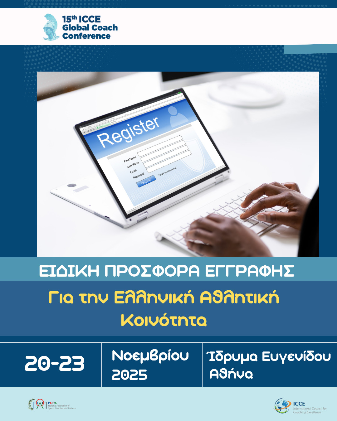 Στο πλαίσιο της διεξαγωγής του ICCE Global Coach Conference 2025, που θα πραγματοποιηθεί 20–23 Νοεμβρίου 2025 στο Ίδρυμα Ευγενίδου στην Αθήνα, ανακοινώνεται ειδική μειωμένη τιμή εγγραφής ύψους 200€ αποκλειστικά για την ελληνική κοινότητα των προπονητών, ακαδημαϊκών και επαγγελματιών του αθλητισμού.